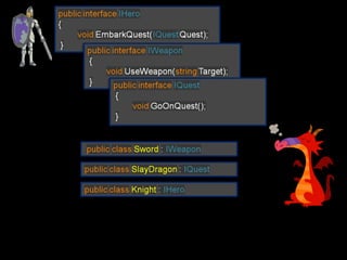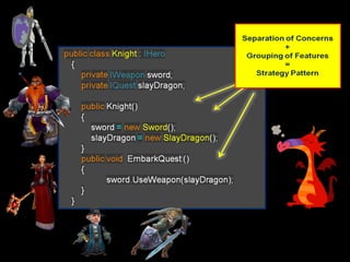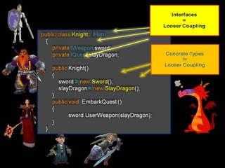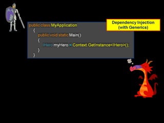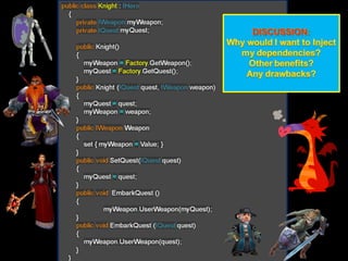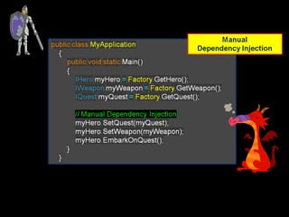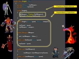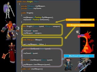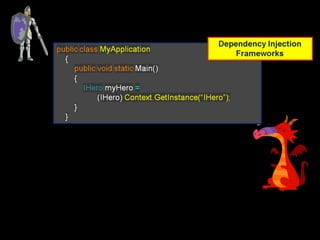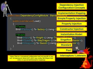 This document discusses dependency injection and inversion of control design patterns. It recommends using dependency injection frameworks like Castle Project, Spring.NET, and Unity as they provide benefits like flexibility, configurability, and testability. It provides examples of how dependency injection allows switching behaviors through configuration rather than recompiling code. The document also covers interceptors, listeners, and other advanced topics but does not discuss type converters, sockets, or WCF integration in depth.