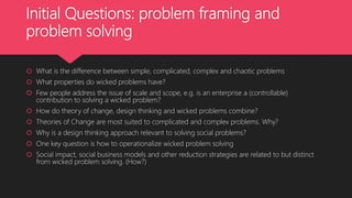 The document discusses the nature of wicked problems, contrasting them with simpler issues, and explores problem framing and solving through design thinking. It emphasizes that wicked problems require nuanced, adaptable solutions rather than one-size-fits-all approaches, and includes examples like indigenous disadvantage and obesity as complex issues needing coordinated efforts. The text also posits that design thinking may play a crucial role in addressing these problems through participatory and innovative strategies.