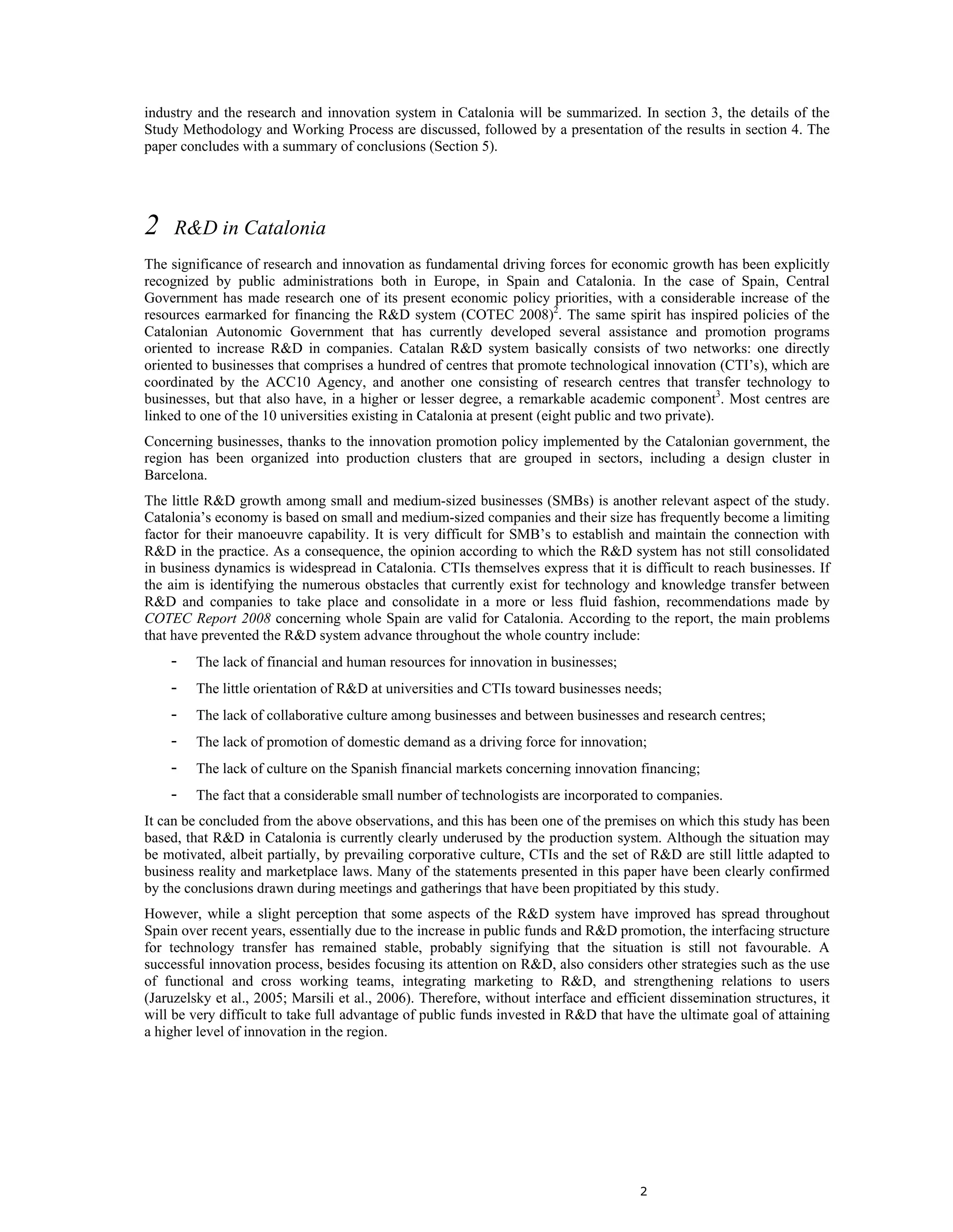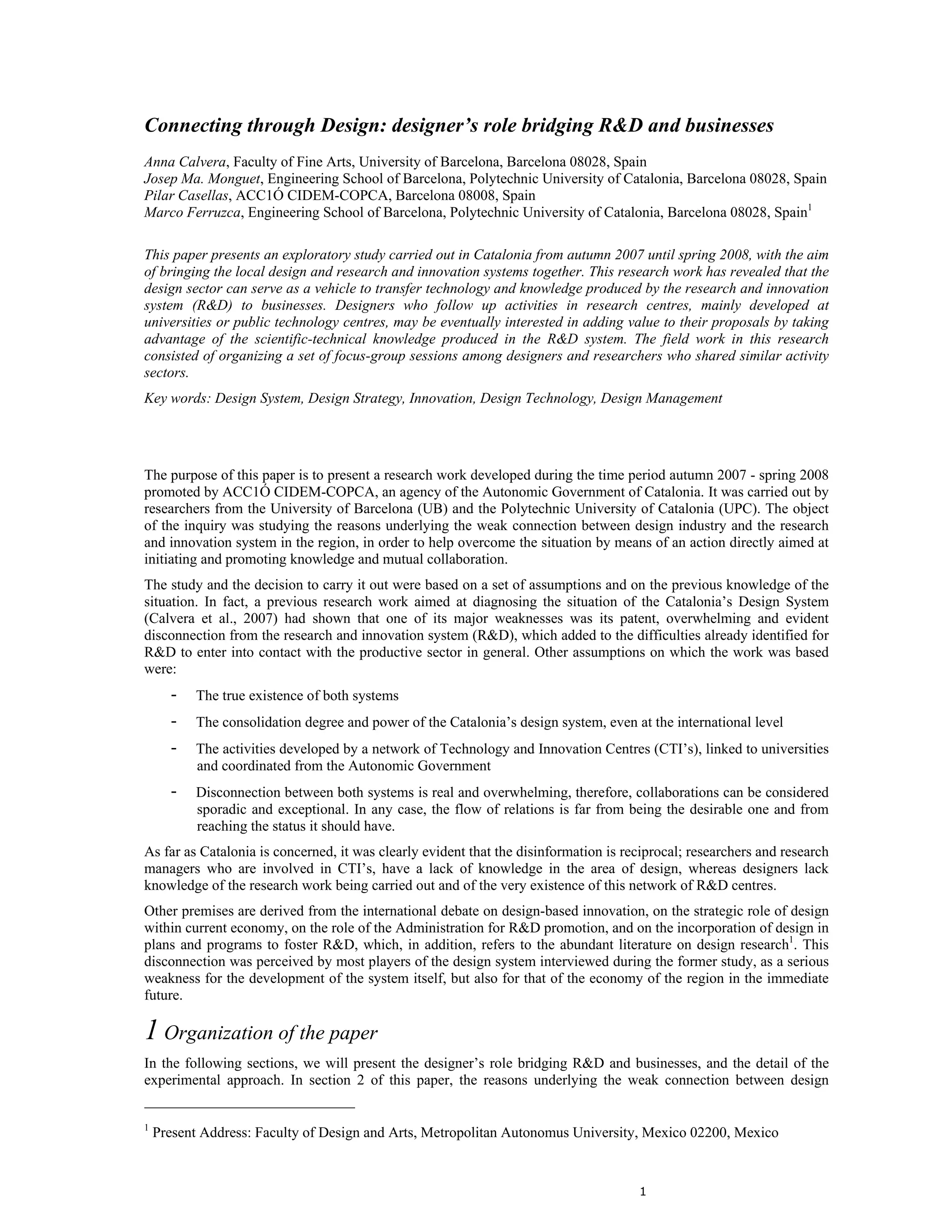 The paper discusses a study conducted in Catalonia from 2007 to 2008 aimed at bridging the gap between the local design sector and research and innovation (R&D) systems. It highlights the disconnection between designers and researchers, revealing that designers are often unaware of R&D opportunities, while researchers lack understanding of design's role in innovation. The study emphasizes the need for better collaboration strategies to utilize R&D resources effectively for economic growth in the region.