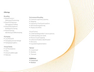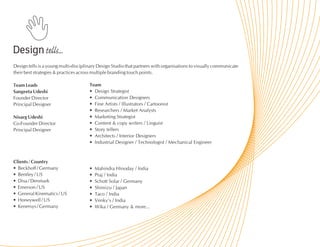 Design tells is a multi-disciplinary design studio that partners with organizations to communicate branding strategies through visual design across multiple touchpoints, offering services such as branding, packaging, signage, exhibitions, and virtual media. It has an international client base and teams of designers, strategists, artists, and other specialists. The document provides examples of Design tells' work and contact information.