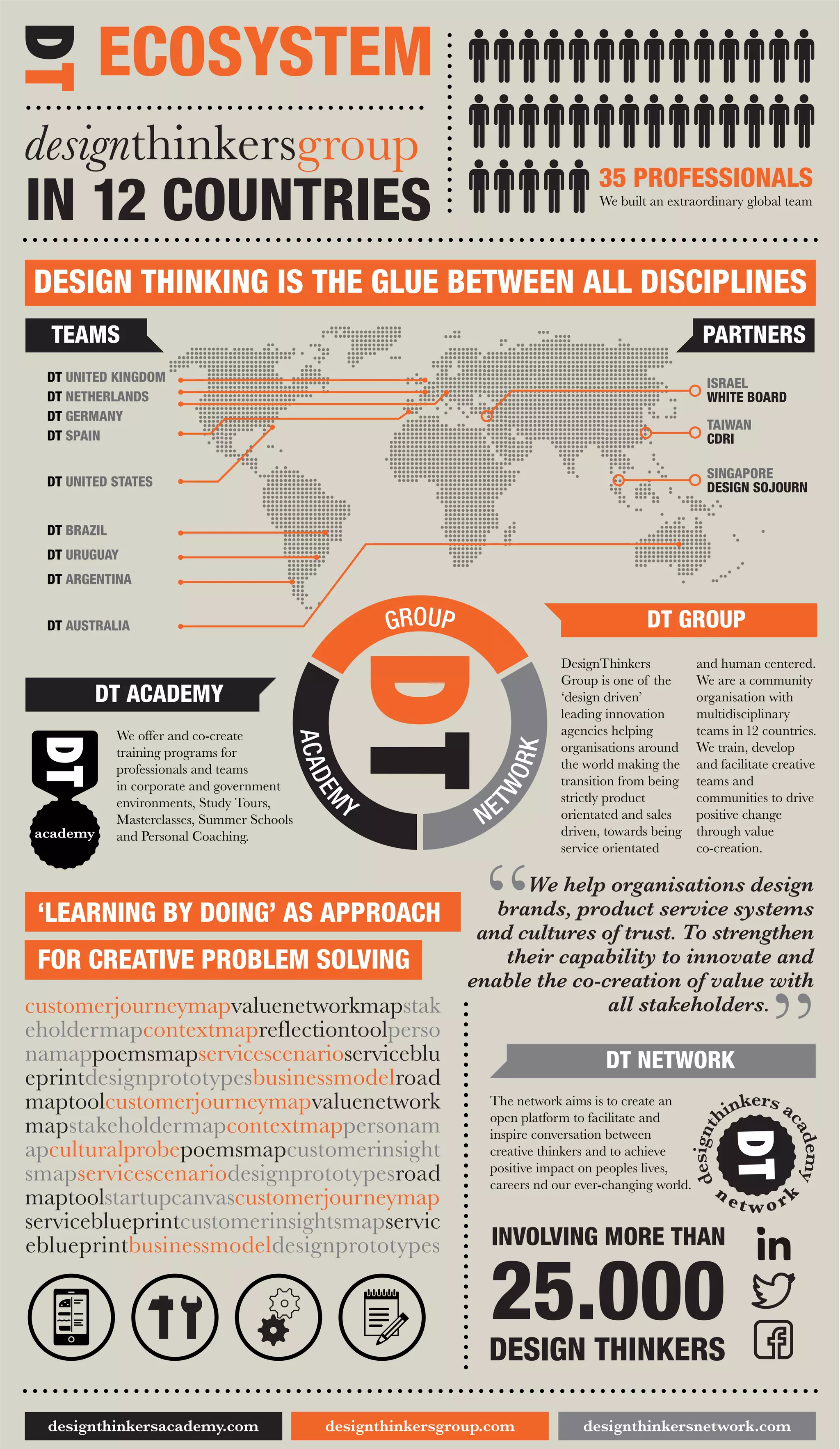 DesignThinkers Academy is a global network of over 25,000 design thinkers across 12 countries that offers training programs, study tours, and coaching to professionals and organizations. It aims to facilitate conversations between creative thinkers and achieve positive impact. The network helps organizations strengthen their innovation capabilities and enable co-creation of value with stakeholders through design thinking.