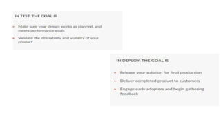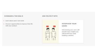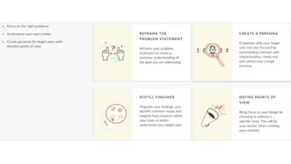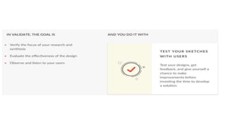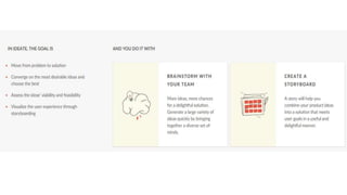 This document provides an introduction to design thinking and prototyping. It discusses the key steps in design thinking, including empathizing with users, defining problems from their perspective, ideating solutions, prototyping ideas, and testing prototypes with users. Various techniques are covered, such as creating personas, mapping user journeys, defining points of view, brainstorming, and prototyping with different levels of fidelity. The importance of prototyping is emphasized as a way to facilitate communication, enable user input, assess feasibility, and reduce development time.