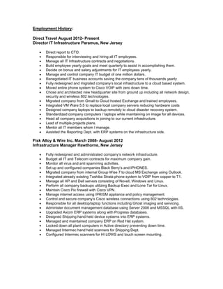 The document provides a summary of Christopher Desimone's experience and qualifications. It outlines his career history working in IT management roles over the past 15+ years, including his current role as Director of IT Infrastructure. It also lists his technical skills and training in areas such as Windows Server, Active Directory, virtualization, networking, and various software programs.