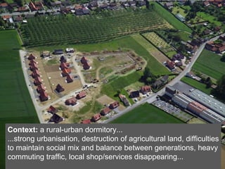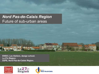 The document discusses a project in the Nord Pas-de-Calais region of France to address issues facing suburban areas, including loss of agricultural land and local services and heavy commuting. The project proposes creating 7 clusters of new services around local train stations to facilitate more sustainable living for commuters. Design schools helped by generating ideas for 30 sustainable services through video brainstorming and creating a demonstrator to spur strategic conversations about improving quality of life in suburban areas.