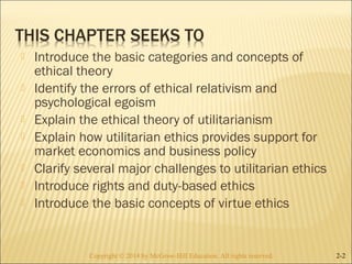 The document discusses several topics in ethical theory as they relate to business, including utilitarianism, relativism, egoism, and justice. It addresses criticisms of each view and debates their implications. For example, it examines whether CEO pay is just given inequality and whether cultural practices like child labor can be criticized. Overall, the document introduces key concepts in ethics and debates their application to issues in business and economics.