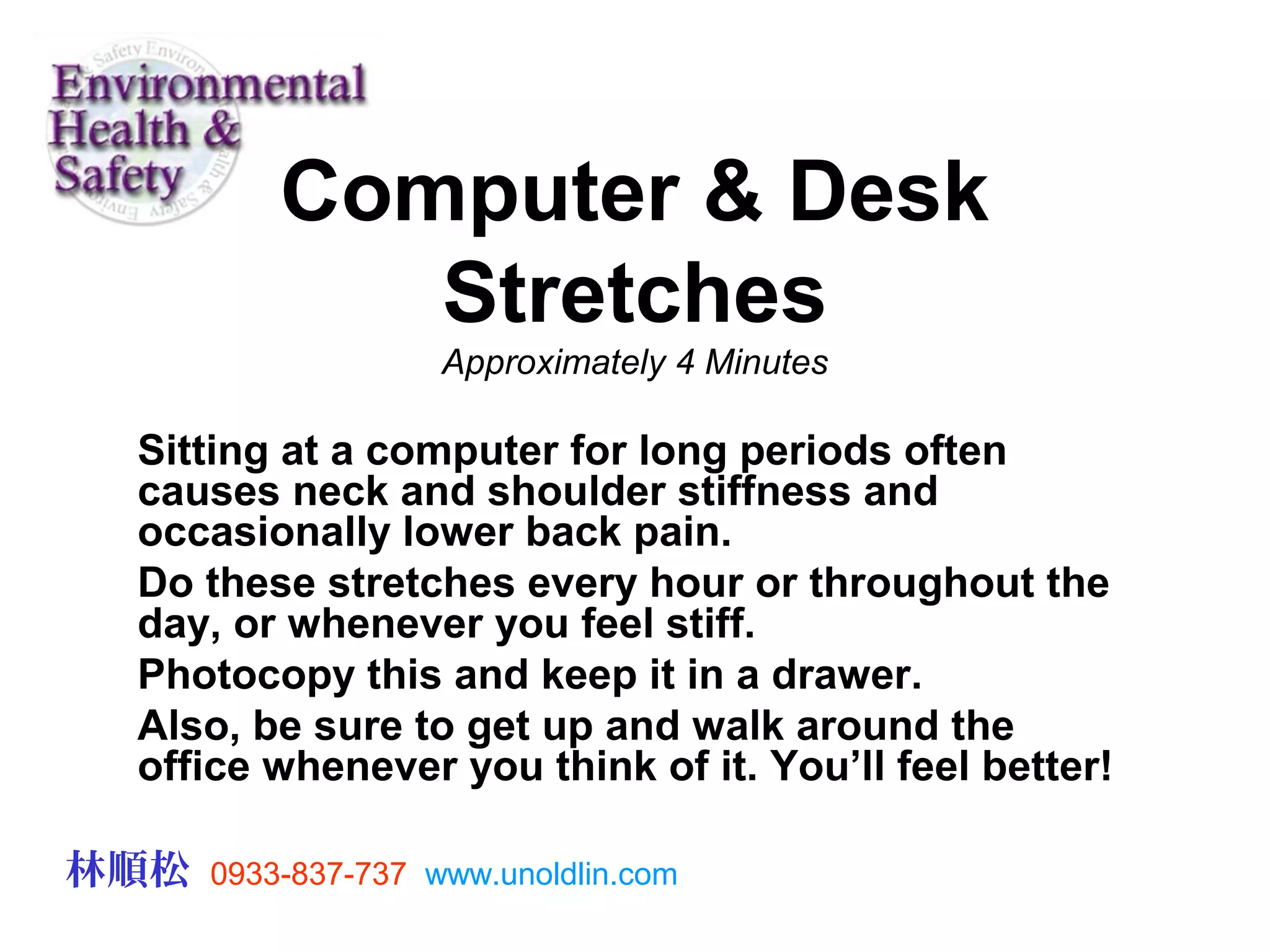 Sitting at a computer for long periods can cause neck, shoulder, and lower back stiffness or pain. The document recommends doing stretches every hour or throughout the day to relieve this. It also suggests photocopying the stretches and keeping them handy, as well as taking walks around the office whenever possible to feel better.