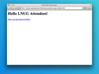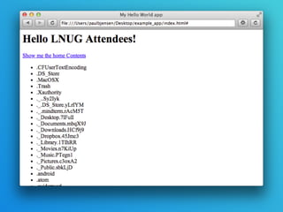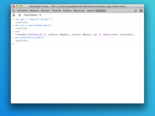 Node Webkit allows you to create desktop applications using HTML, CSS, JavaScript and Node.js modules. It combines the Chromium browser and Node.js framework. This allows building cross-platform desktop apps that can include Node functionality and access system resources. Examples are given of apps built with Node Webkit. Key aspects covered include how it integrates Chromium and Node.js, building a basic app, window rendering options, menus, tray apps, and the developer tools. Benefits for a medical conference app replacement are discussed.