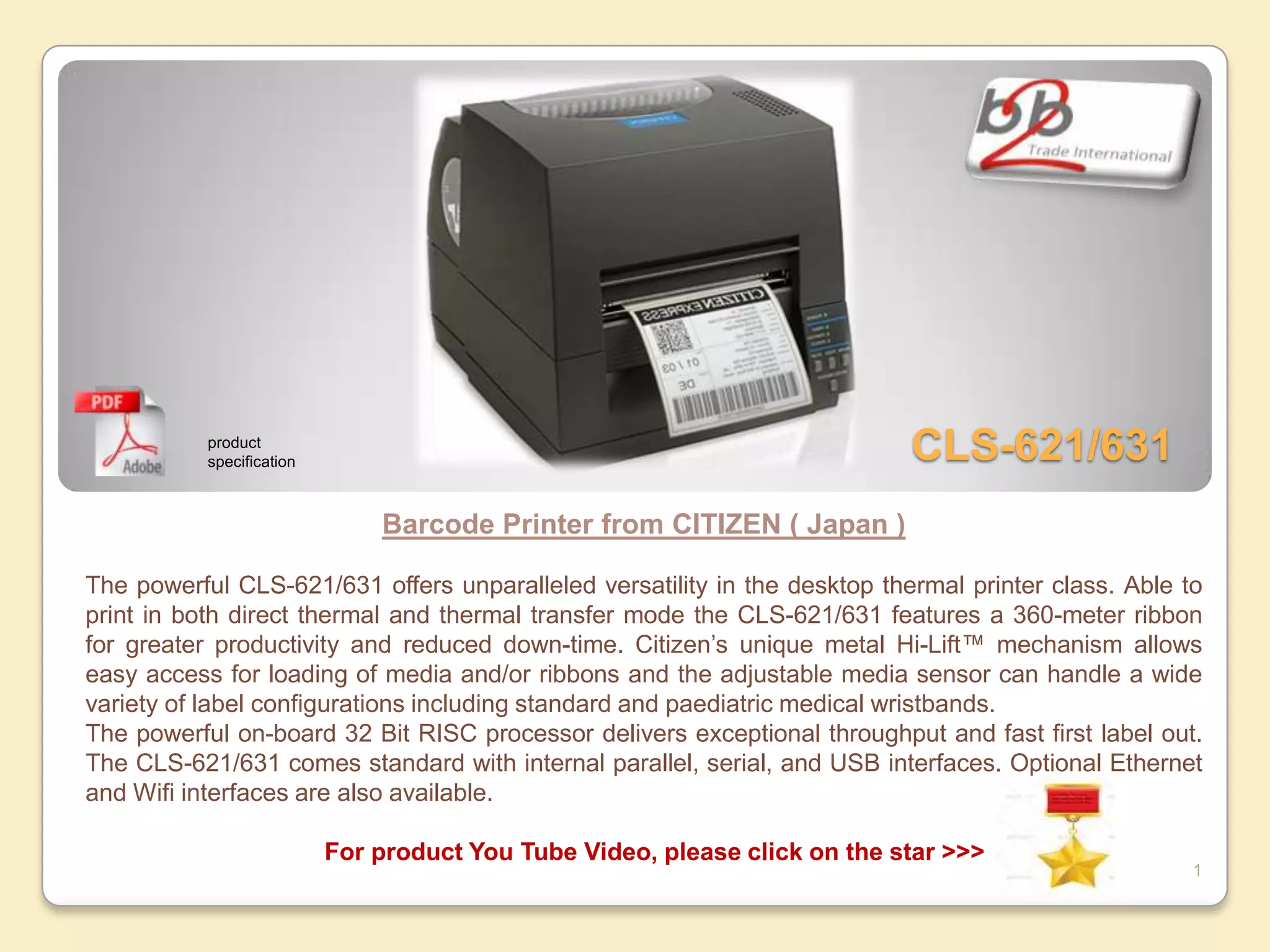 The document provides product specifications for several barcode printers from different manufacturers. It describes the key features of the Citizen CLS-621/631 printer, including its versatility in printing modes, long ribbon lifespan, media loading mechanism, and processing power. It also summarizes the Zebra GK printer's fast print speed, included connectivity options, and ability to switch between label formats. Finally, it outlines the GT-800 printer from Zebra, highlighting its enhanced performance, large ribbon capacity, fast print speed, and powerful processor.