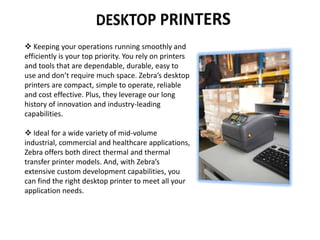 The document discusses Indian Barcode Corporation, a New Delhi based company that provides barcode solutions including barcode scanners, printers, and software. It has over 15 years of experience in providing stock and inventory solutions. The company offers various Zebra barcode printers for applications like labeling, manufacturing, retail, and healthcare. These include desktop, industrial, and mobile printers in both thermal transfer and direct thermal models.