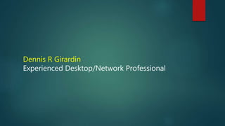 This document is a resume for Dennis R Girardin summarizing his experience as a desktop and network professional. It lists his areas of expertise including IT infrastructure, network administration, hardware and software troubleshooting. It then details his work history from 2018 to 2008, where he held roles providing technical support, desktop support, and field service technician positions for various companies, demonstrating experience with technologies like Windows, Active Directory, Office 365, and troubleshooting various hardware and software issues.