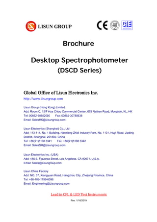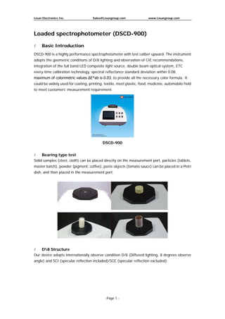 The document provides an overview of various spectrophotometer models including the DSC-D900, DSC-D901, and DSC-D910, detailing their specifications, measurement capabilities, and suitable applications in industries such as coating, printing, and healthcare. Each model features advanced calibration technology, precise measurement parameters, and includes accompanying software for color data management and quality control. The document serves as a comprehensive guide for potential users, outlining technical data, operating instructions, and contact information for Lisun Electronics.