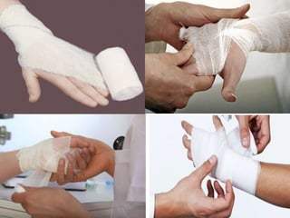 Desmurgy is a branch of surgery related to dressings and bandages. Bandages are an integral part of first aid and are used for wounds, bleeding, and immobilizing fractures. Common bandages include triangular bandages, bandages with rubber adhesive, and elastic bandages. Proper bandage application involves using a larger bandage size than the wound and securing it properly. Common bandage types are triangular, circular, spiral wrap, and figure eight bandages. Each has specific uses and application techniques for parts of the body. It is important to check circulation after applying a bandage.
