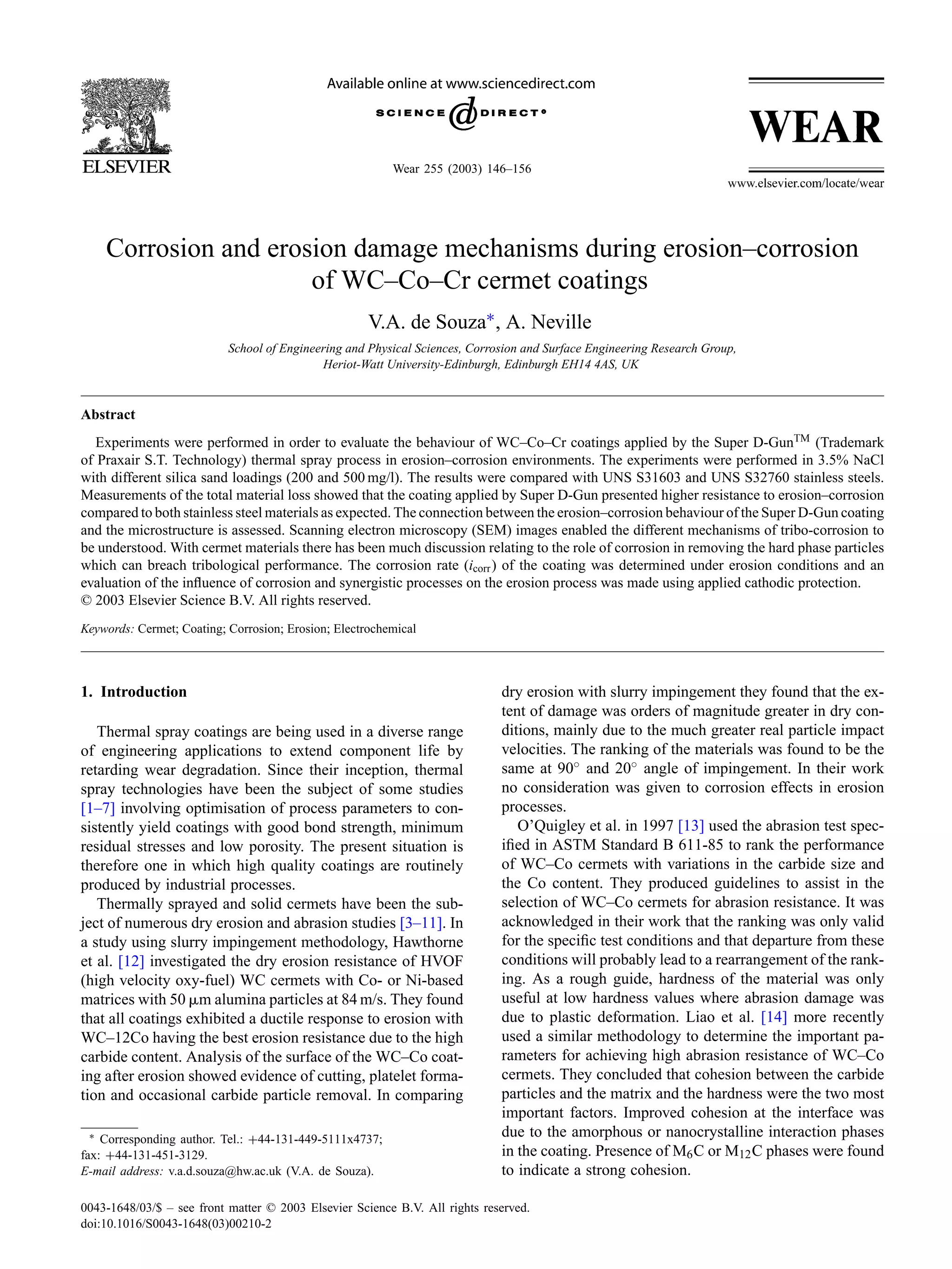 The document summarizes research on the erosion-corrosion behavior of WC-Co-Cr cermet coatings applied by thermal spraying. Experiments were conducted exposing the coatings to a liquid-solid jet of 3.5% NaCl solution with silica sand loadings of 200 and 500 mg/l. Electrochemical measurements and surface analysis using SEM were used to understand the corrosion and erosion damage mechanisms. Cathodic protection was applied to isolate the erosion effects. The results showed the WC-Co-Cr coating had higher resistance to erosion-corrosion compared to stainless steel controls. Microstructural characterization revealed the coating had a lamellar structure and composition of WC-12% Co-6% Cr with