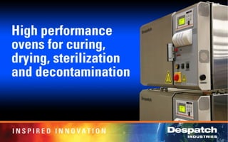 This document describes various types of ovens used for medical device manufacturing and processing. It outlines ovens for curing coatings and adhesives, high performance drying, critical sterilization and decontamination, and various types of ovens like benchtop, clean process, continuous, reach-in, truck-in, and customized ovens. Key details are provided for several oven models, including temperature ranges, materials, features, and applications. Custom ovens can also be designed and manufactured for unique medical device processes and needs.