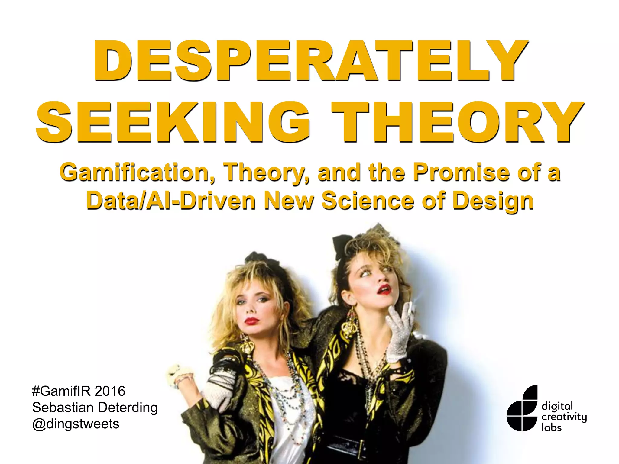 The document discusses the urgent need for a theoretical framework in gamification to enhance design science by addressing how cognitive states influence behavior and design features. It highlights the limitations of current gamification practices and advocates for the development of an empirical taxonomy and mechanistic models to better understand motivational processes. The author calls for a new approach that integrates research into a large-scale design lab for practical experimentation and knowledge advancement.