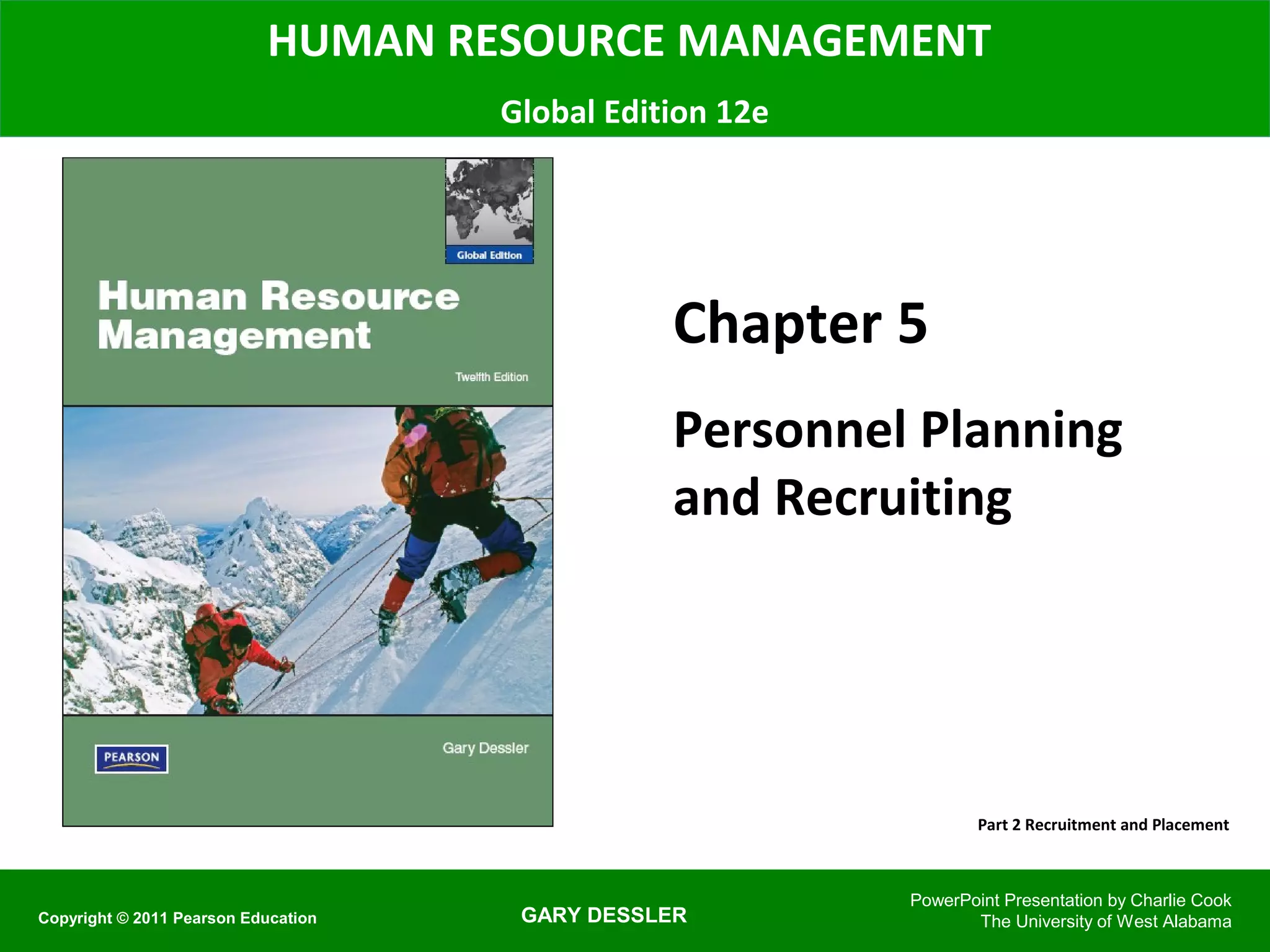 This chapter discusses personnel planning and recruiting. It covers the recruitment and selection process, including forecasting personnel needs, determining internal and external candidate sources, and evaluating recruiting effectiveness. The key steps in recruitment are deciding what positions to fill, building a candidate pool through sources like referrals, screening applicants, selecting candidates through interviews, and making offers. Effective recruiting requires evaluating factors like the job market and legal compliance.