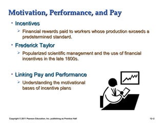 This PowerPoint presentation discusses pay for performance and financial incentives. It covers several theories of motivation including Maslow's hierarchy of needs, Herzberg's hygiene-motivator theory, Vroom's expectancy theory, and reinforcement theory. It also discusses different types of incentive plans such as individual incentive plans like piecework and merit pay plans, sales compensation programs, organizationwide incentives, executive compensation, and team or group-based variable pay programs.