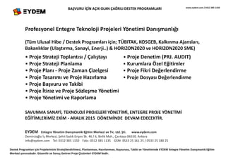 Profesyonel Entegre Teknoloji Projeleri Yönetimi Danışmanlığı (Tüm Ulusal Hibe / Destek Programları için; TÜBITAK, KOSGEB, Kalkınma Ajansları, Bakanlıklar (Ulaştırma, Sanayi, Enerji..) & HORIZON2020 ve HORIZON2020 SME) • Proje Strateji Toplantısı / Çalıştayı • Proje Strateji Planlama • Proje Planı - Proje Zaman Çizelgesi • Proje Tasarımı ve Proje Hazırlama • Proje Başvuru ve Takibi • Proje İtiraz ve Proje Sözleşme Yönetimi • Proje Yönetimi ve Raporlama • Proje Fikri Değerlendirme • Proje Dosyası Değerlendirme • Proje Denetim (PRJ. AUDIT) • Kurumlara Özel Eğitimler SAVUNMA SANAYİ, TEKNOLOJİ PROJELERİ YÖNETİMİ, ENTEGRE PROJE YÖNETİMİ EĞİTİMLERİMİZ EKİM - ARALIK 2015 DÖNEMİNDE DEVAM EDECEKTİR. EYDEM Entegre Yönetim Danışmanlık Eğitim Merkezi ve Tic. Ltd. Şti. www.eydem.com