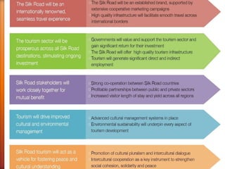 The document outlines the historical significance and modern implications of the Silk Road, detailing its origin during the Han dynasty and periods of heavy use. It highlights the current revival efforts led by the UNWTO to promote cultural exchange, trade, and tourism through the Maritime Silk Road and overland trade routes. Additionally, it discusses various tourism types, including cruise, nature-based, heritage, and culinary tourism, focusing on Asian markets.