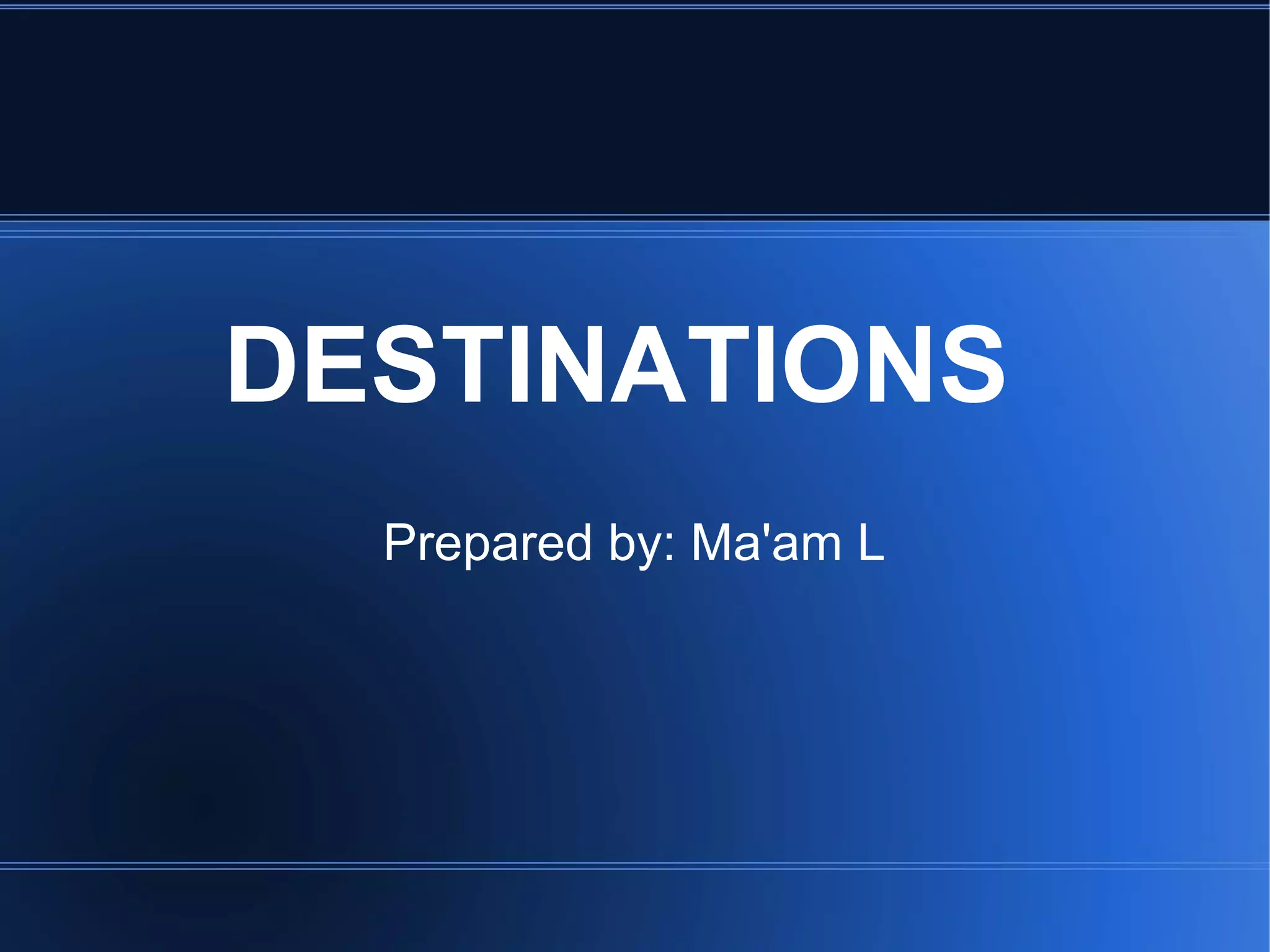 - There are different types of destinations like coastal, urban, and rural with examples given.