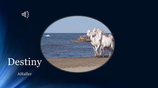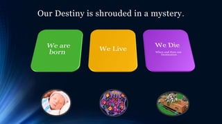 This document discusses the concepts of destiny, fate, fortune, and different views on what happens after death. It examines three potential views: 1) finite life with no afterlife, 2) endless reincarnation, and 3) eternal life with resurrection. It also includes a story about a man who visits his deceased college girlfriend's husband decades later and views a memorial video of her life, set to the song "I Know You're Out There Somewhere."