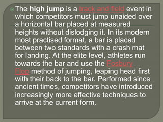 The document provides details about the high jump event in track and field. It describes the history and basic rules of the event, including the Fosbury Flop technique used by elite athletes. Key details include the men's and women's world records held by Javier Sotomayor and Stefka Kostadinova. The document also discusses specifications for the runway, crossbar, shoes and different types of landing mats used in high jump competitions.