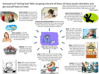The document provides a list of ten stress-relief activities including talking to a friend, meditating, listening to music, reading, planning a vacation, cleaning, writing, cooking, exercising, and completing work tasks. Each suggestion is presented in a casual tone with encouragement to take action and improve one's mood. The author emphasizes that these activities have personally proven effective for managing stress.