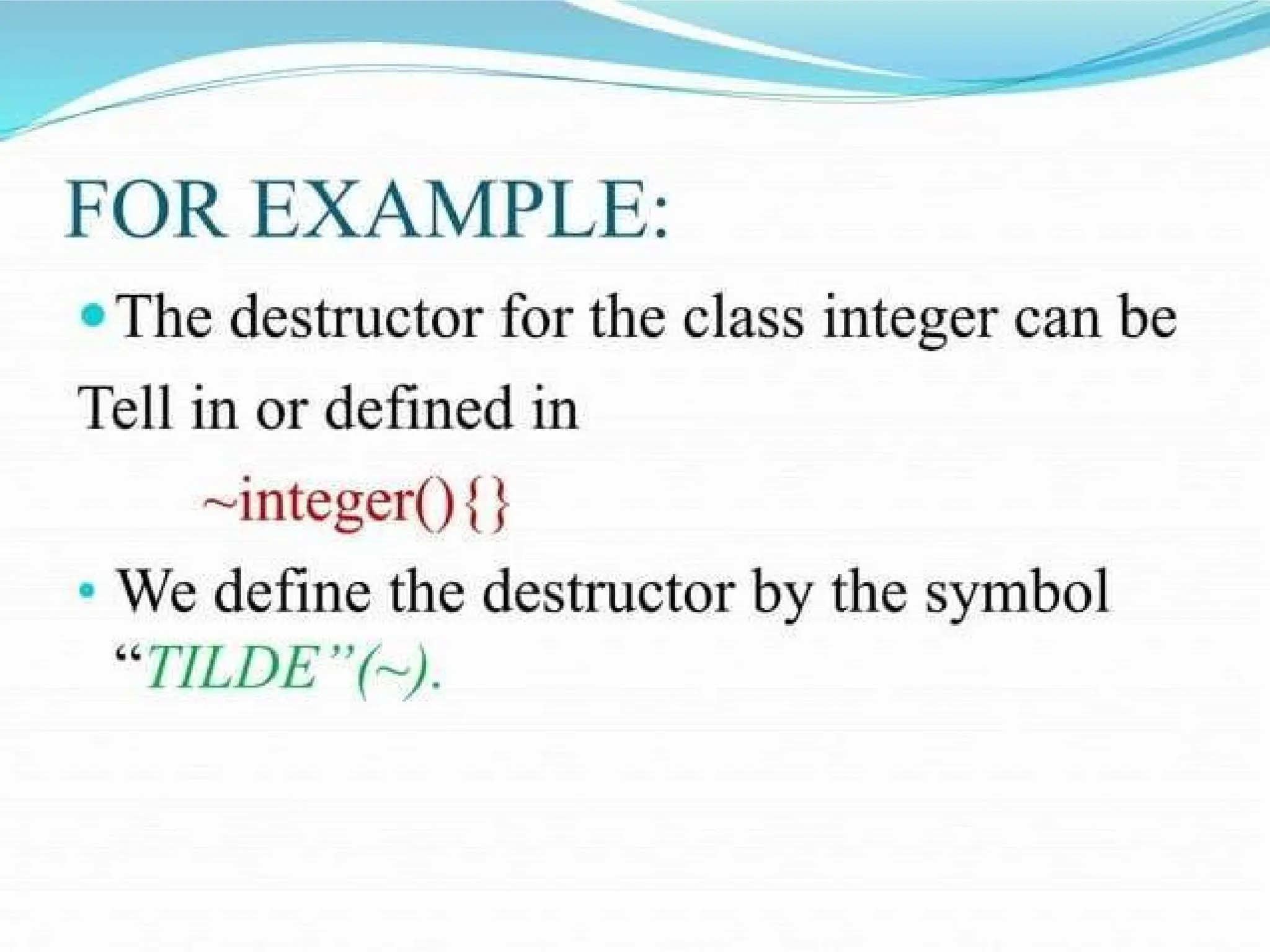 The document details the syntax and characteristics of destructors in C++, explaining how they are defined within or outside a class and their role in object destruction. Destructors have the same name as the class preceded by a tilde, cannot be overloaded or declared static/const, and are automatically called when an object goes out of scope. An example illustrates the execution of a constructor and its corresponding destructor.