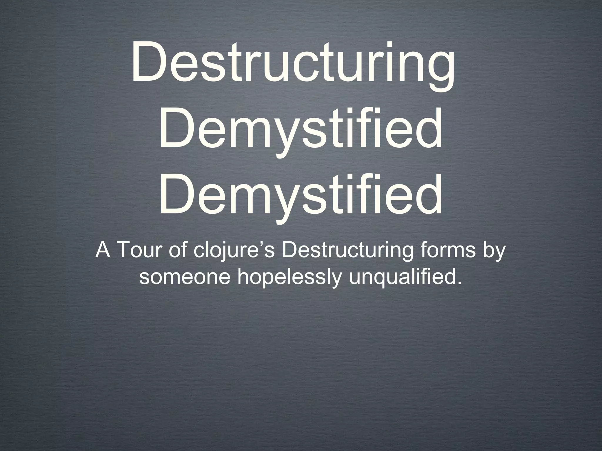 The document explores Clojure's destructuring forms, detailing their purpose, usage, and benefits for code readability and focus. It emphasizes avoiding unnecessary complexity in data access, encouraging restructuring when calling nth or exploring constants. Additionally, it covers various destructuring features including handling vectors and maps, providing tips on nested destructuring and other data structures.