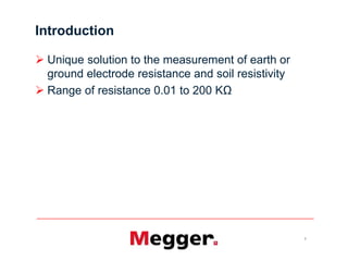 This document describes the features and measurement techniques of an instrument used to measure earth electrode resistance and soil resistivity. It can measure resistance from 0.01 to 200 KΩ. The instrument is IP54 rated and allows for 2, 3, and 4-point testing using attached rods or stakeless measurement. It has user-selectable test frequencies and output voltages. The document explains the principles and procedures for two-terminal, three-terminal, attached rod, stakeless, and four-terminal resistance and resistivity measurements. Potential and current probe resistances and ground noise voltages are also discussed.