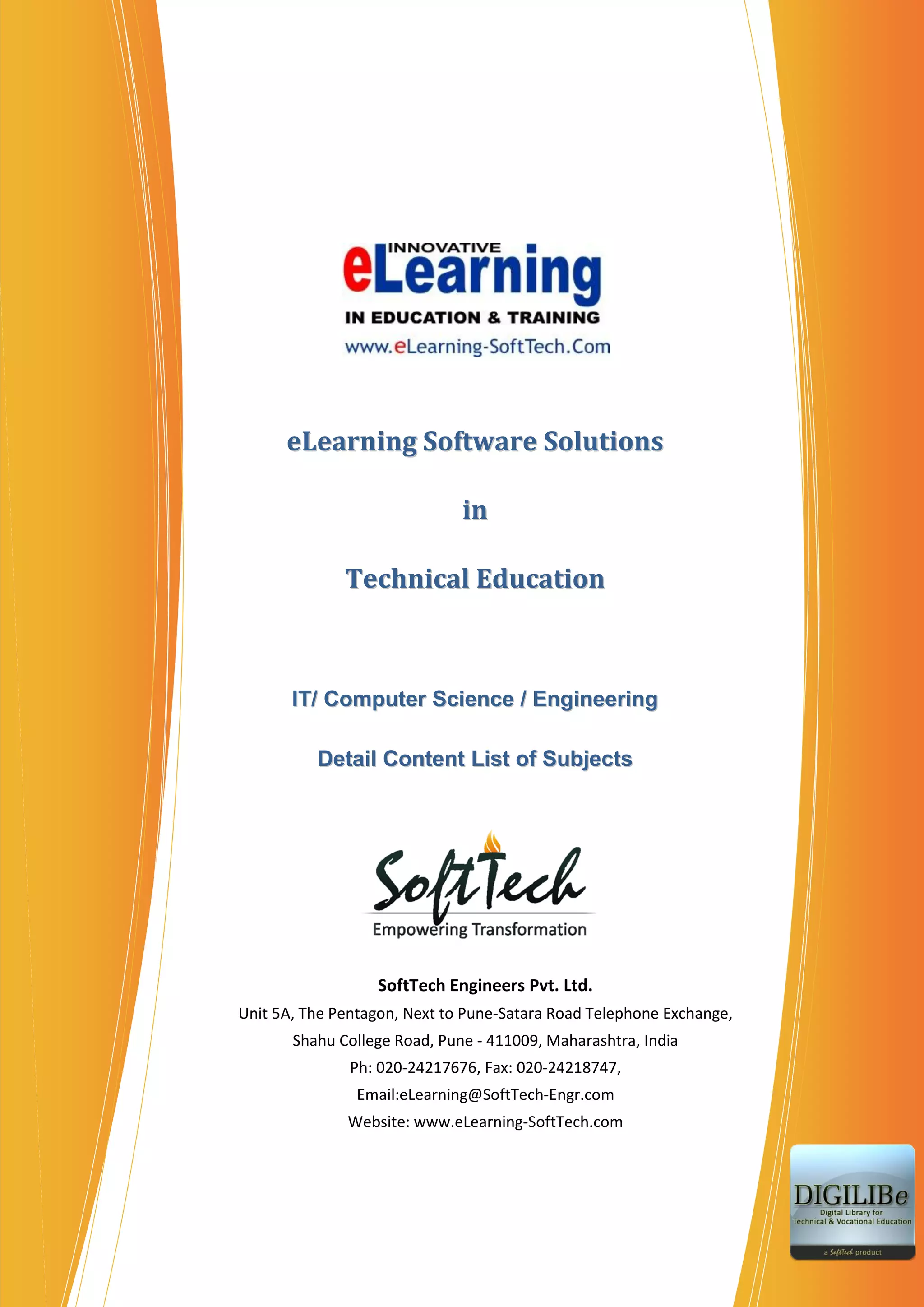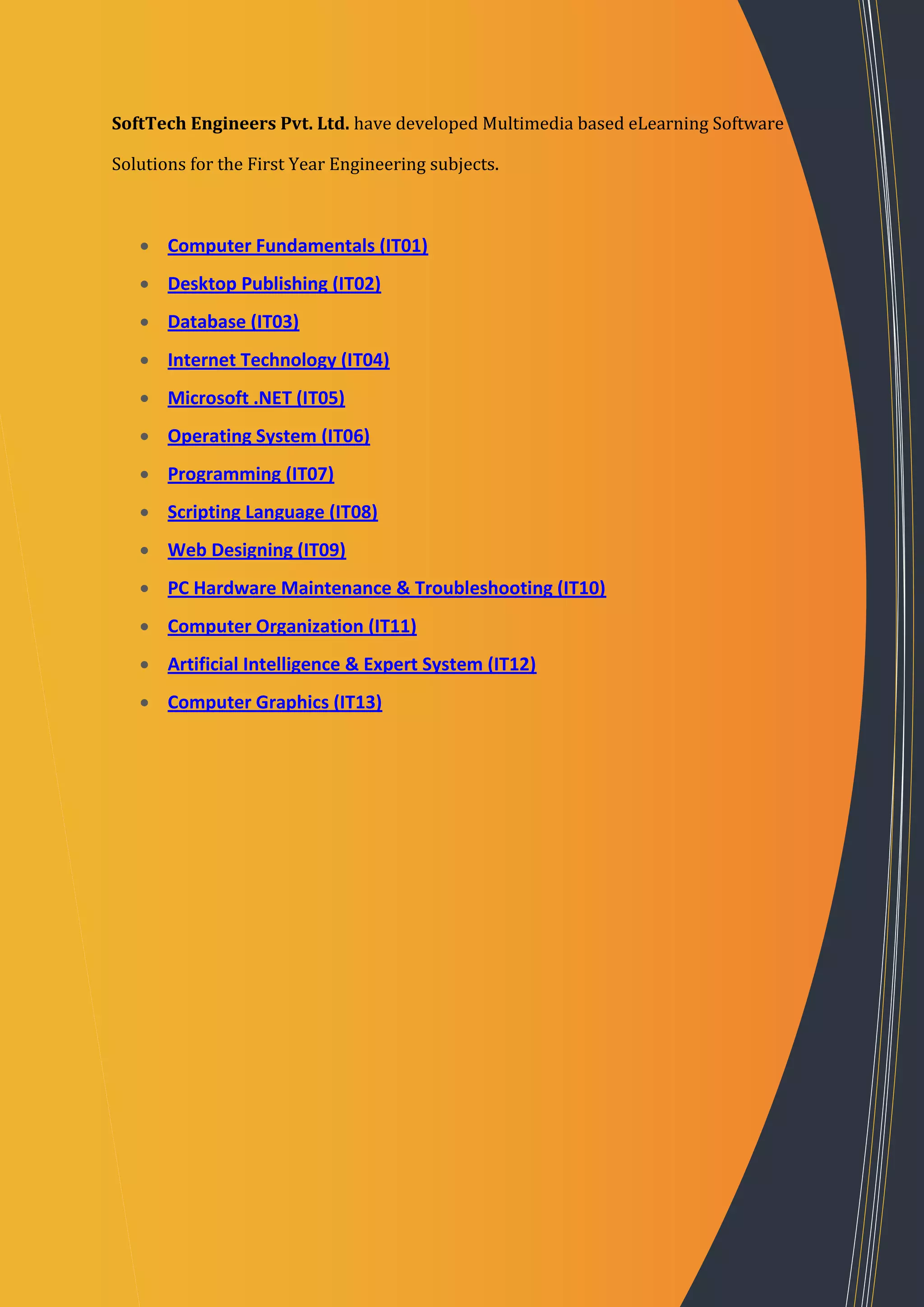 SoftTech Engineers Pvt. Ltd. have developed eLearning software solutions for first year engineering subjects including Computer Fundamentals, Desktop Publishing, Databases, Internet Technology, Microsoft .NET, Operating Systems, Programming, Scripting Languages, and Web Designing. The document provides detailed content lists for each subject area covering topics like windows, typing, computer basics, word, access, internet surfing, PC troubleshooting, networking, excel, power point, page maker, corel draw, introduction to databases, SQL, functional dependencies, transaction processing, security and more.