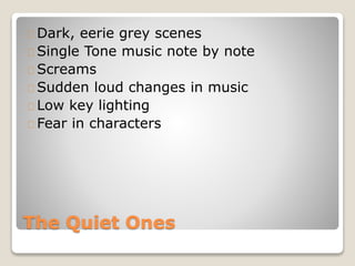 The document provides a detailed analysis of conventions used in horror genre films. It discusses common settings, technical codes, iconography, narrative structures, character types, and themes. Key elements analyzed include the use of lighting, camerawork, sound, editing, and mise-en-scene to build tension, fear, and suspense. An example trailer is then deconstructed to show how it employs many horror genre conventions to effectively promote the film.