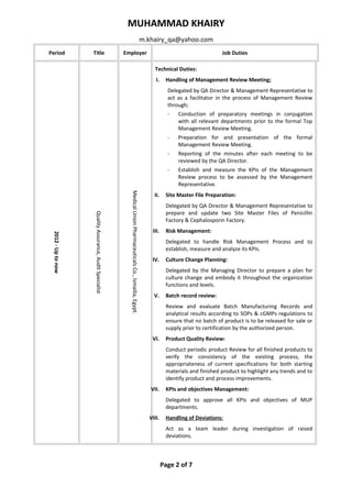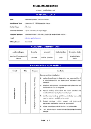 This document provides a summary of Muhammad Khairy's qualifications and experience. It includes his personal details, academic credentials, employment history at Medical Union Pharmaceuticals Co. from 2009 to present where he works as a Quality Assurance and Audit Specialist, job achievements and awards, qualification courses and certifications, and areas of on-the-job training. His roles and responsibilities have expanded over time to include management of audits, change control, risk management, and quality systems.