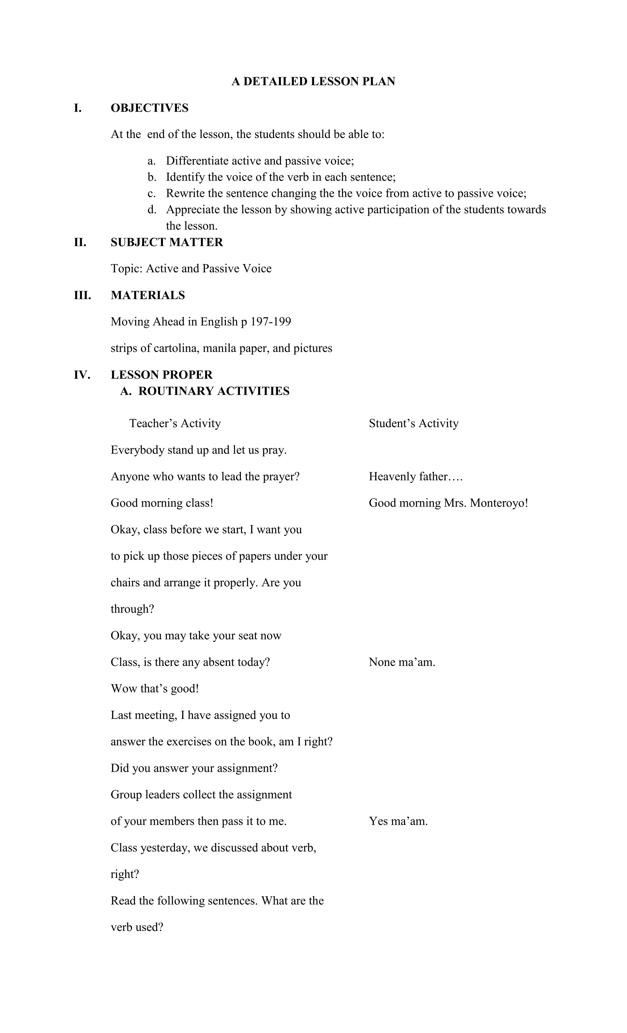 This document provides a detailed lesson plan on teaching active and passive voice to students. The objectives are to differentiate between active and passive voice, identify the voice in sentences, rewrite sentences by changing the voice, and ensure student participation. The lesson plan outlines introductory activities, motivation, presentation of the topic, application through exercises, and evaluation. Key points are distinguishing active voice where the subject performs the action from passive voice where the subject receives the action.