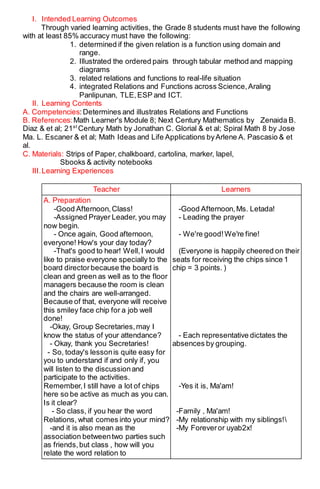 The lesson plan summarizes a math lesson on relations and functions taught to an 8th grade class. The plan outlines the intended learning outcomes, lesson contents from references, learning experiences through group activities, and assessment of student understanding. The lesson integrates concepts from multiple subjects like science, social studies, and technology and relates functions to real-world examples of relationships and careers to enhance student engagement and comprehension.
