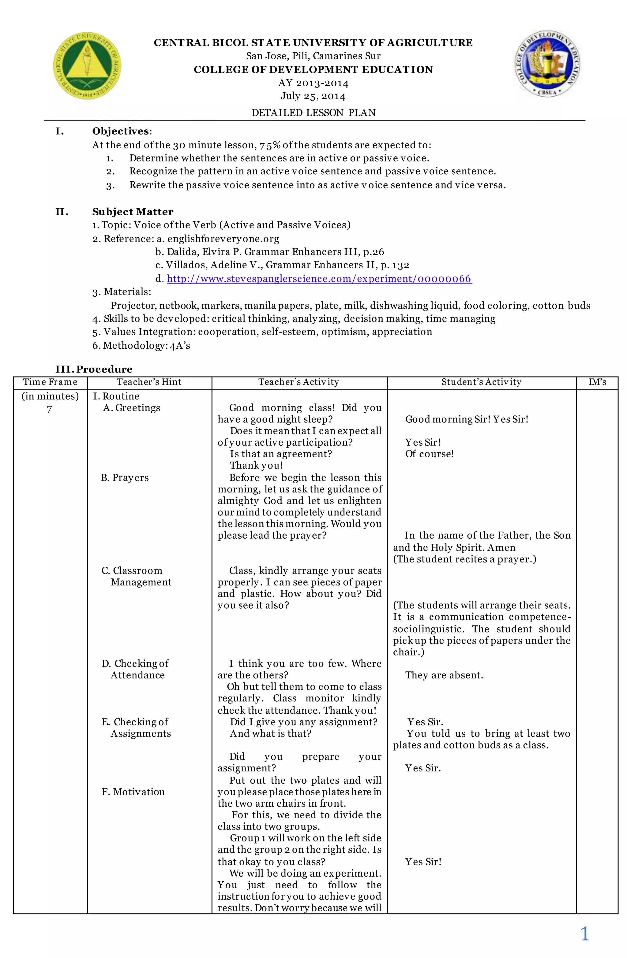 The document is a detailed lesson plan for a grammar lesson on active and passive voice. The objectives are for students to determine if sentences are active or passive voice, recognize patterns in each, and rewrite sentences from one voice to the other. Examples of active and passive sentences are analyzed. Students then practice identifying the voice of sentences and rewriting them in the opposite voice.