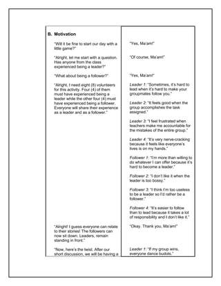The document outlines a lesson plan for a Grade 10 English class prepared by Regine Kyle Regida, focusing on the poem 'The Leadership' by Phillip Blytheville. It includes objectives such as appreciating literature and developing reading comprehension, along with a detailed procedure that emphasizes student participation through discussions, activities, and group presentations. The lesson aims to analyze the poem's themes regarding leadership and civic responsibility while integrating values of unity and cooperation.