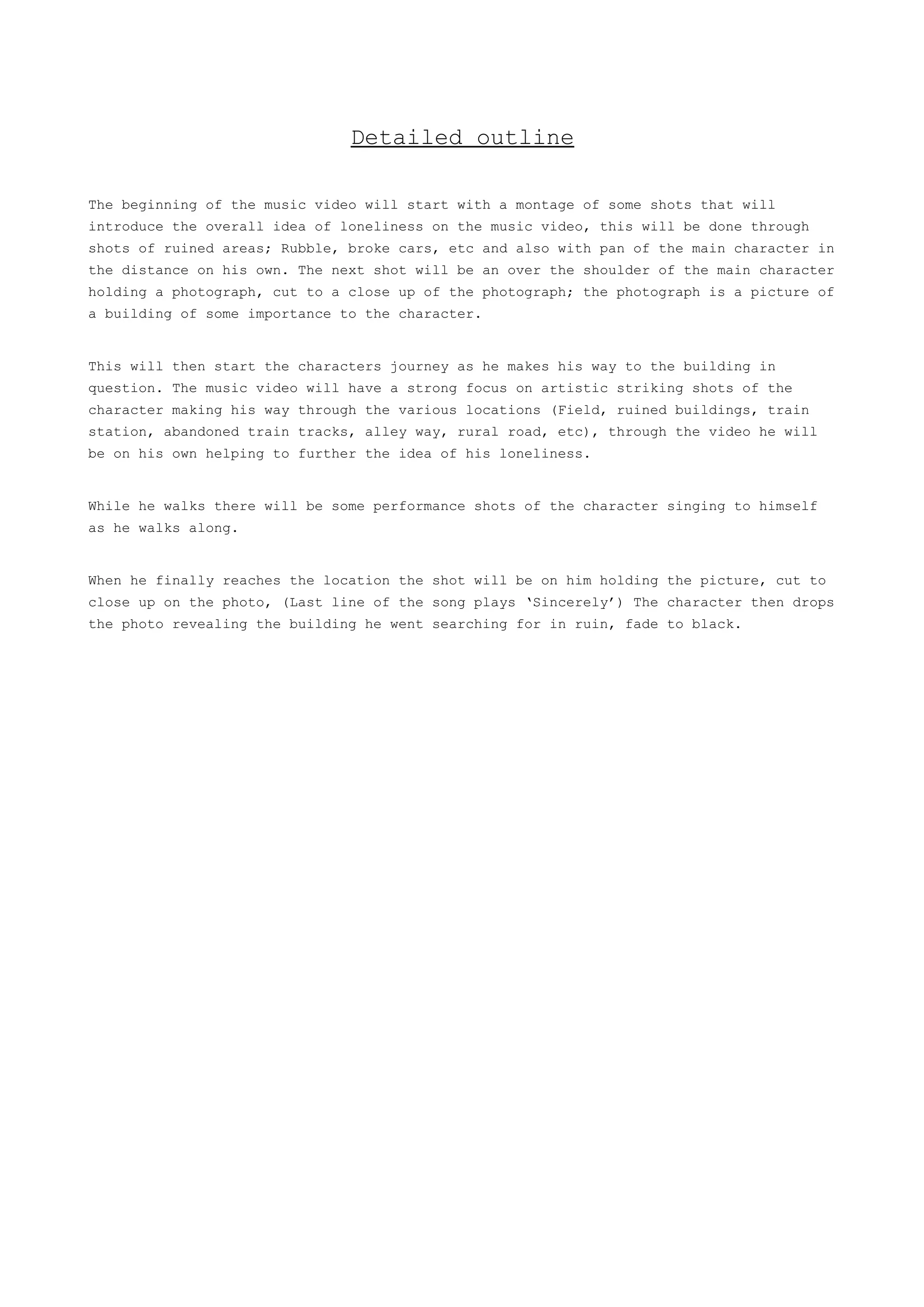 The music video will start with shots introducing the main character's loneliness by showing ruined areas and the character alone in the distance. It will then show the character holding a photograph of an important building and starting a journey to find it. Throughout his journey along fields, buildings, and transportation routes, there will be artistic shots of the lone character walking and occasionally singing. When he reaches the location, a close-up will show the building in the photograph is also in ruins, conveying the character's continued loneliness.