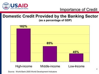 The document discusses how development credit programs can help unlock private financing for clean energy projects in Asia. It provides examples of how USAID's Development Credit Authority uses loan guarantees and other credit support mechanisms to catalyze investment in renewable energy, energy efficiency, and other sectors. By mitigating risks for lenders, credit guarantees can help address capital constraints and accelerate the transition to sustainable energy.
