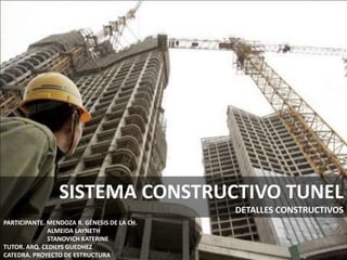 This document presents details of a tunnel construction system. It includes details of the foundation, walls, and formwork. The formwork system uses horizontal and vertical steel panels along with angled and vertical props to form the tunnel structure. Additional details show solutions for longer spans using semi-tunnels connected by walkways. Diagrams illustrate plan views and sections of the system with labels for different components.