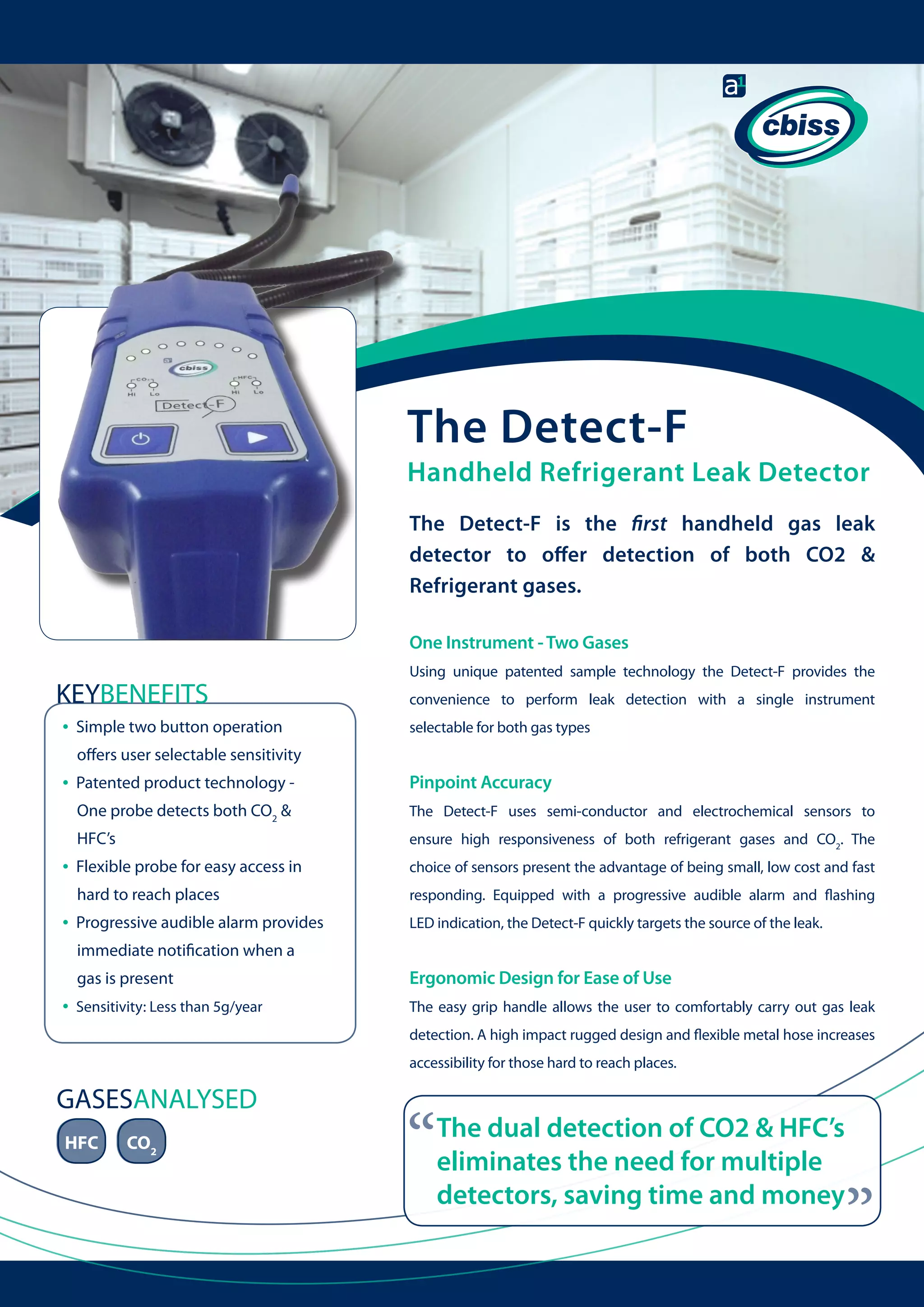 The Detect-F is a handheld leak detector that can detect both CO2 and refrigerant gases using a single instrument. It has a simple two-button operation, offers adjustable sensitivity, and features a flexible probe for accessing hard to reach places. The detector uses patented technology with semiconductor and electrochemical sensors to quickly pinpoint gas leaks through a progressive audible alarm and LED display.