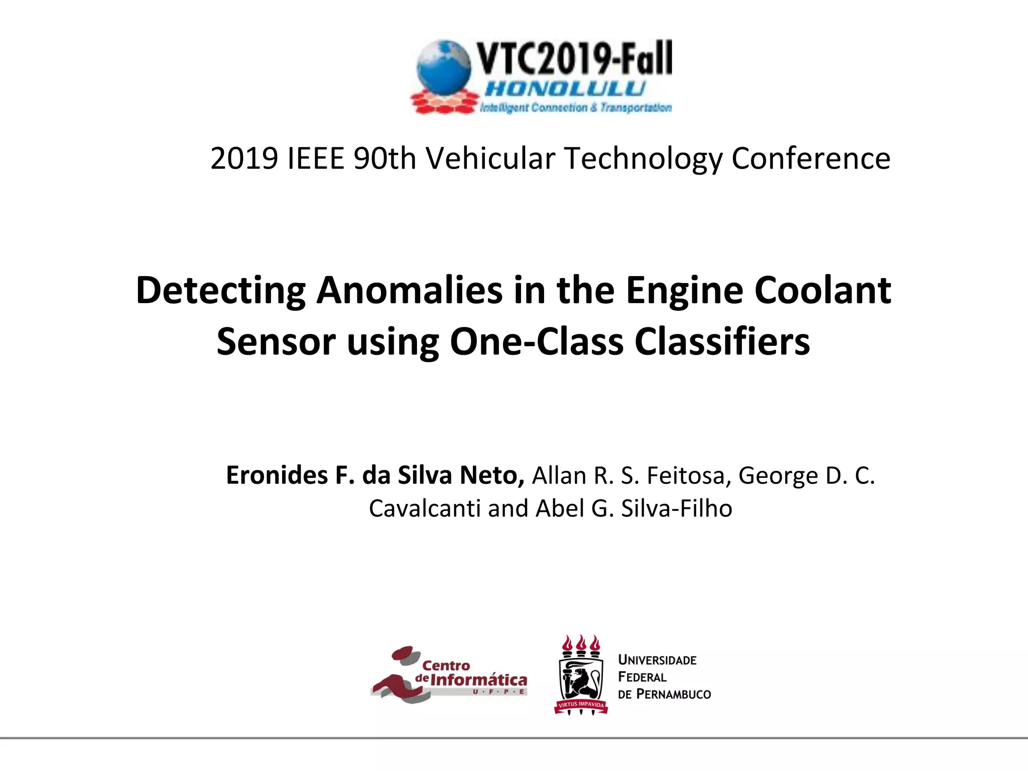 This document summarizes a study that detects anomalies in engine coolant temperature sensors using one-class classifiers. It describes how data is acquired from vehicle sensors and preprocessed, features like temperature, load, and their statistics are extracted. Different one-class classifiers like k-NN, OC-SVM, and Gaussian methods are evaluated on normal and artificially injected anomalous data. The results show k-NN and OC-SVM perform best for idle and motion modes respectively, demonstrating these techniques can detect sensor malfunctions of different severity levels.
