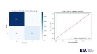 The document discusses fraud detection in financial transactions, emphasizing the importance of identifying fraudulent activities to prevent financial losses and maintain consumer trust. It details a dataset with 11,142 records, highlighting class imbalance between legitimate and fraudulent transactions, and outlines machine learning techniques, including logistic regression, random forest, and gradient boosting, for model training and evaluation. The analysis concluded that gradient boosting was the most effective model in distinguishing between fraudulent and legitimate transactions, although limitations such as class imbalance were noted.