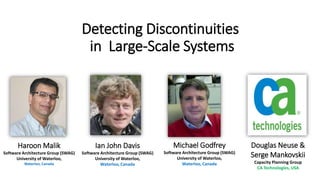 The document proposes an automated approach to help analysts identify discontinuities in large-scale system performance data. The approach involves 4 steps: 1) data preparation to filter noise, 2) metric selection using PCA, 3) anomaly detection using quadratic modeling, and 4) discontinuity identification by comparing distributions using Cohen's D effect size. The approach was tested on synthetic, ecommerce, and industrial system data and achieved high accuracy in detecting discontinuities, which were verified by experts. However, limitations include difficulty distinguishing overlapping discontinuities and sensitivity to the effect size threshold.