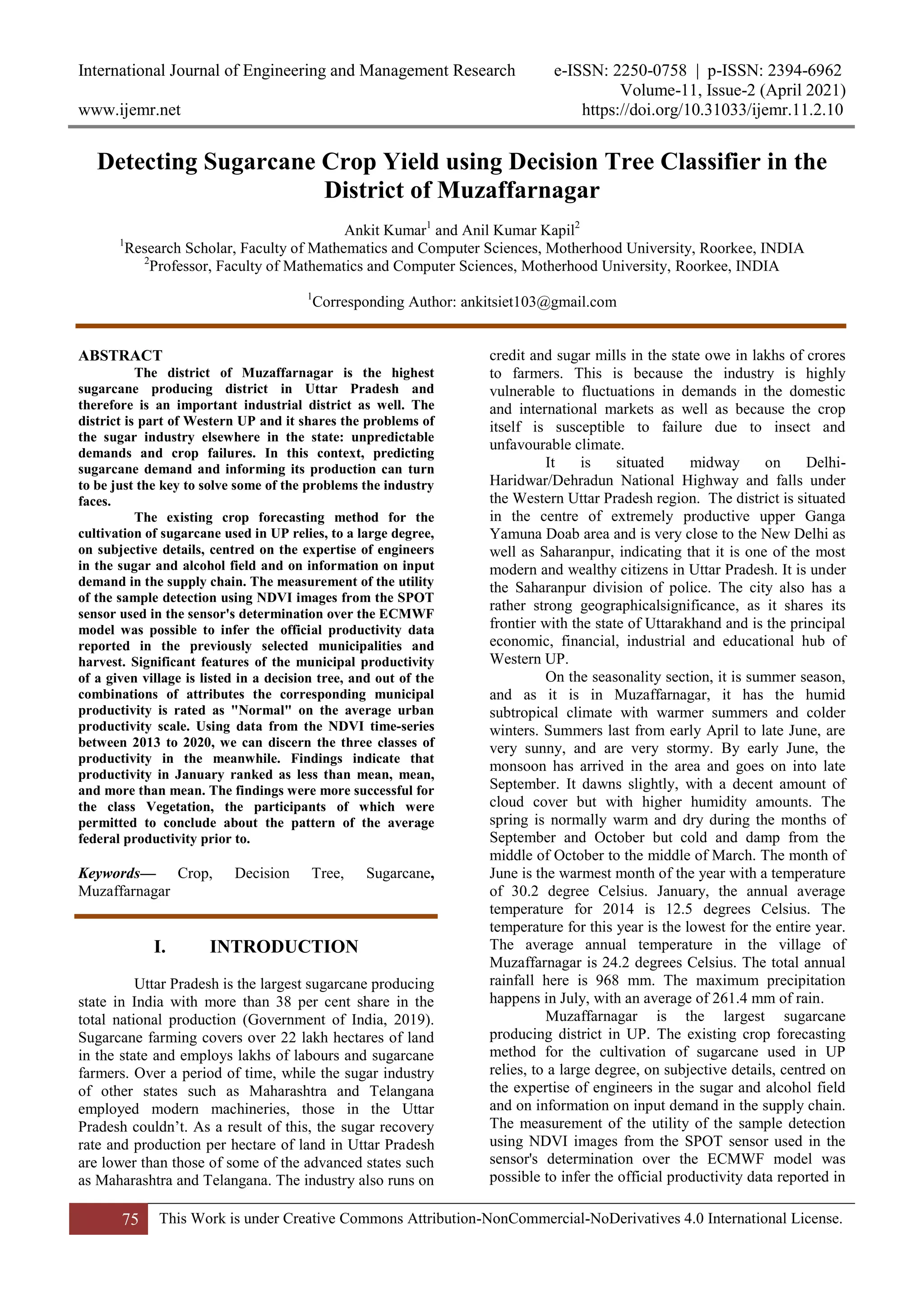 This study investigates sugarcane crop yield prediction in Muzaffarnagar, Uttar Pradesh, using a decision tree classifier and NDVI time-series data from 2013-2020. It highlights the challenges faced by the region's sugar industry, including unpredictable demands and crop failures, while proposing a more objective forecasting method. The findings reveal varying productivity levels and suggest that remote sensing can enhance crop yield assessments.