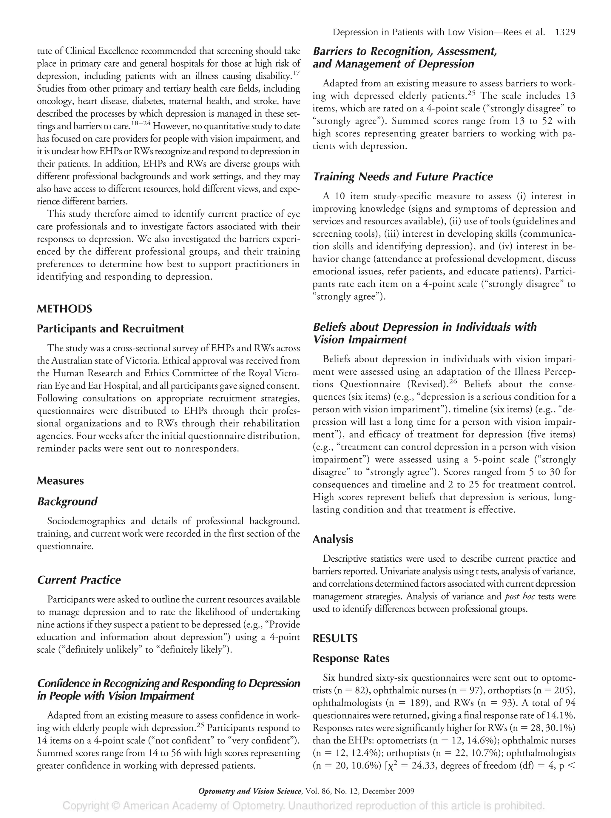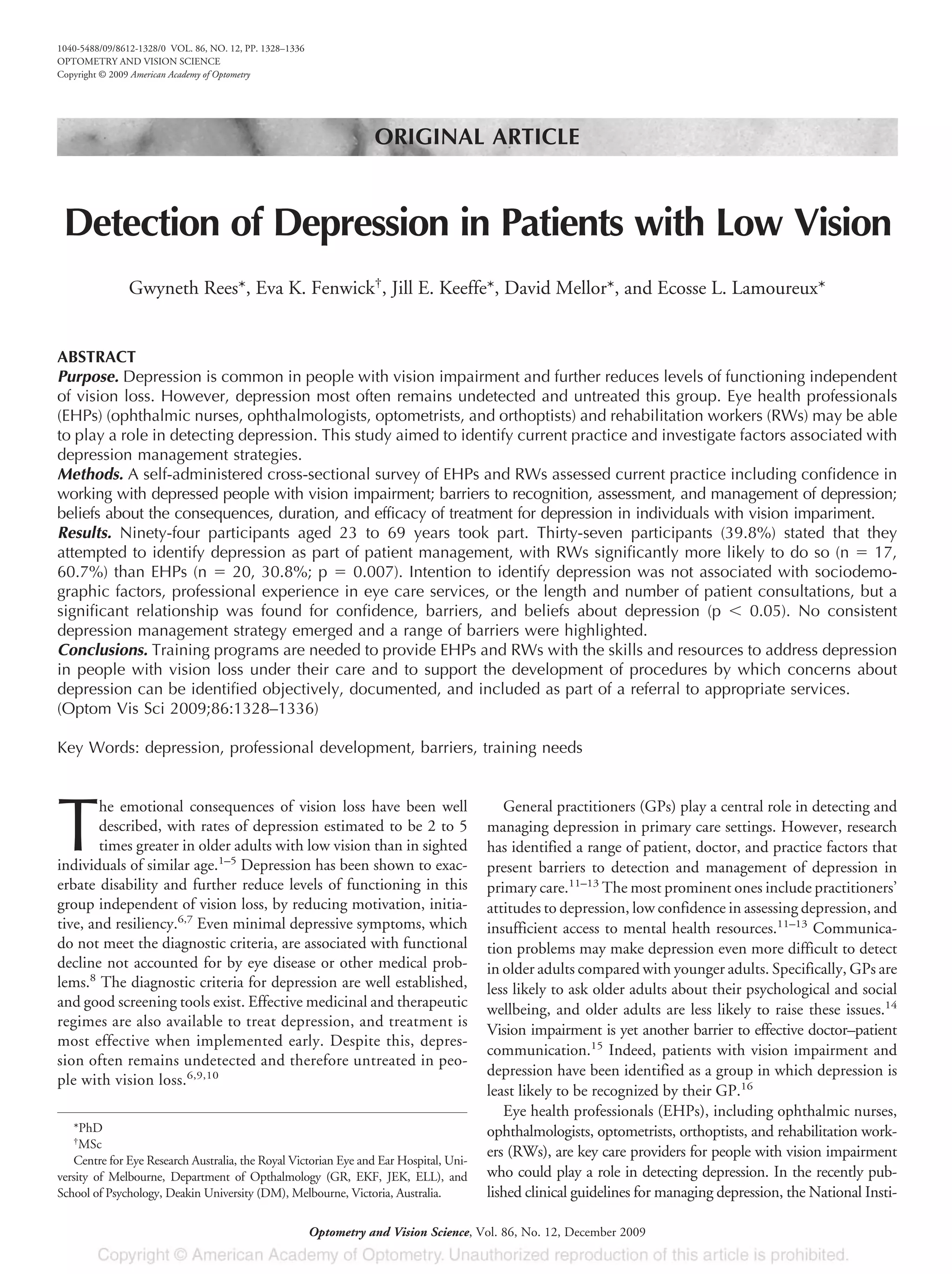 This study aimed to identify current practices for detecting and managing depression in patients with low vision among eye health professionals and rehabilitation workers. A survey of 94 such professionals found that fewer than 40% attempted to identify depression in patients. Rehabilitation workers were more likely than eye health professionals to do so. Those who tried to identify depression reported greater confidence and fewer perceived barriers. The resources and management strategies available varied between settings, with rehabilitation agencies having the most support available. Overall, no consistent strategy for depression management was identified. The study concludes that training is needed to improve skills for addressing depression in patients with low vision.