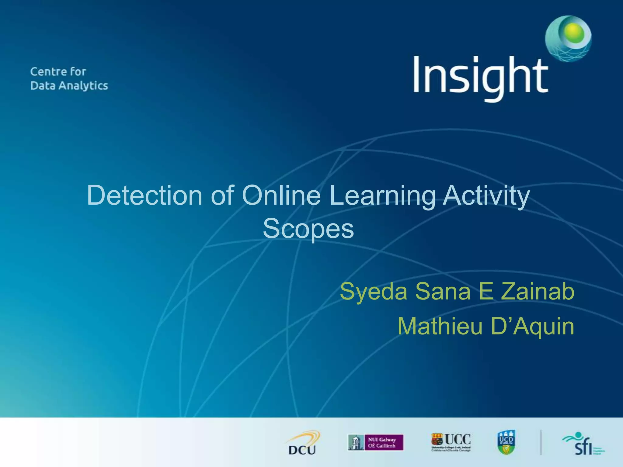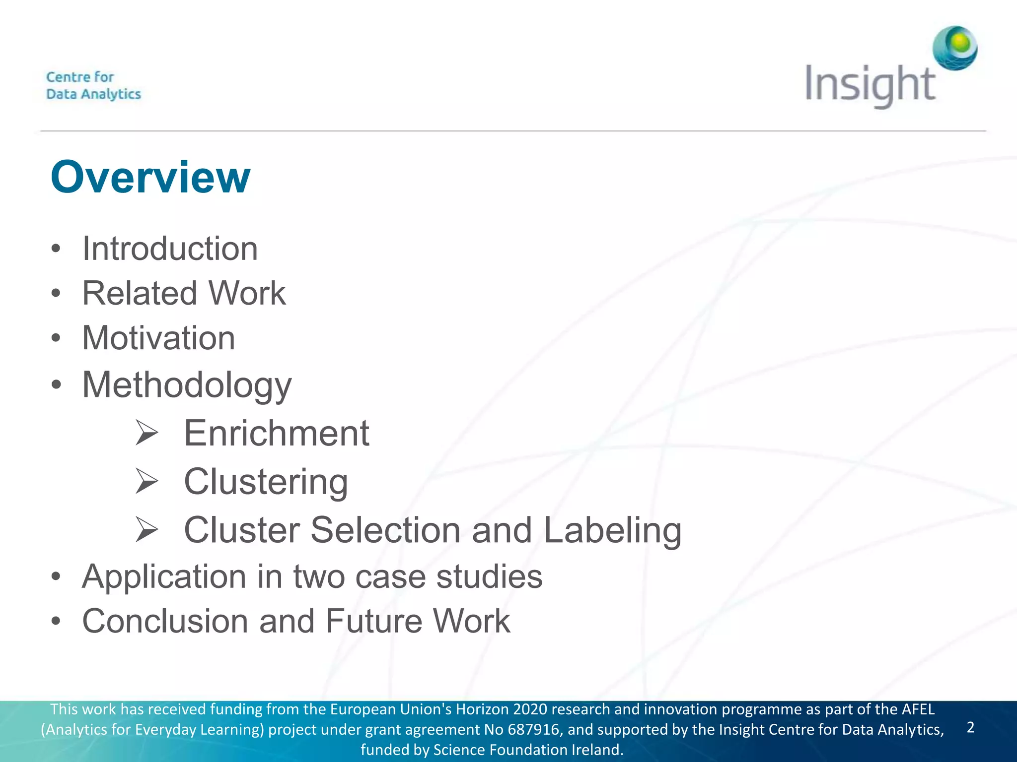 This document outlines a methodology for detecting online learning activities through enrichment, clustering, and cluster selection/labeling. It begins by introducing the challenges of analyzing online learning activities and related work in learning analytics. The methodology is then described in detail, including using named entity recognition to enrich resource profiles, hierarchical clustering of resources, and selecting clusters to label based on coverage. The method is applied in case studies on the Didactalia platform and analyzing a learner's browsing history. Future work includes evaluating benefits for learners and expanding the methodology to other languages.