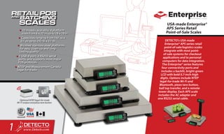 Detecto's USA-made Enterprise® APS series retail scales are designed for point-of-sale systems, featuring multiple connectivity options, various platform sizes, and capacities, as well as a bright LCD display. The document highlights various product series, including price computing scales, digital and hanging scales, and portion control scales, each tailored for different applications and offering features like battery operation, legal-for-trade certifications, and easy cleaning. Additionally, the document emphasizes the versatility and durability of Detecto's scales across multiple industries, including food service, retail, and industrial use.
