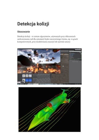 Detekcja kolizji w 2D grafice. Wprowadzenie do algorytmów detekcji kolizji na płaszczyźnie. Podstawowe formy opisujące obiekty. Uproszczenie formy obiektu w celu optymalizacji algorytmów wykrycia kolizji. Obejmuje takie tematy jak: 2D rigid body collision detection, raycasting, continuous collision detection, soft bodies.