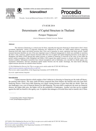 This document summarizes a study on the determinants of capital structure in Thailand. The study analyzed data on 144 Thai listed companies from 2000 to 2011 to examine how firm-specific factors like size, profitability, asset tangibility, growth opportunities, and volatility influence a company's leverage ratios. The results showed that leverage ratios increased significantly with firm size but decreased significantly with profitability, in line with trade-off and pecking order theories. However, tangibility, growth, and volatility did not have significant relationships with leverage ratios. Therefore, the study concluded that firm size and profitability are the main determinants of capital structure for companies in Thailand.